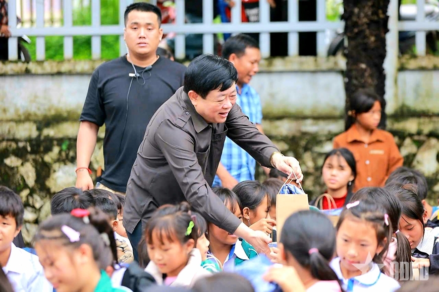 | Đồng chí Nguyễn Thế Kỷ tặng quà cho trẻ em vùng cao. Ảnh do nhân vật cung cấp |
