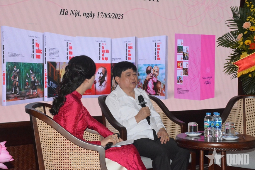 | Nhà văn Nguyễn Thế Kỷ (bên phải) tại Lễ ra mắt bộ tiểu thuyết "Nước non vạn dặm", năm 2025. Ảnh: HOÀNG HOÀNG |