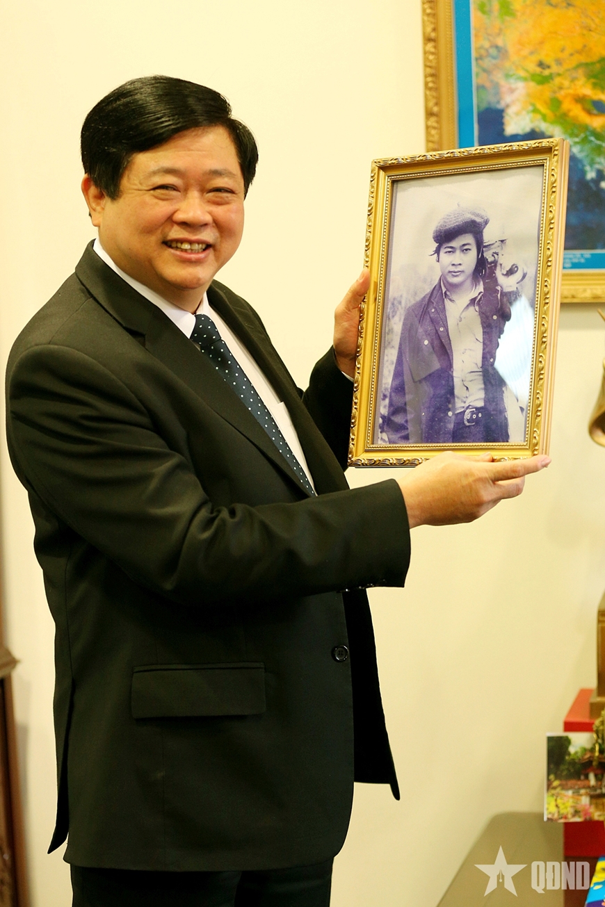| Đồng chí Nguyễn Thế Kỷ bên chân dung của mình khi còn làm phóng viên. Ảnh do nhân vật cung cấp. |