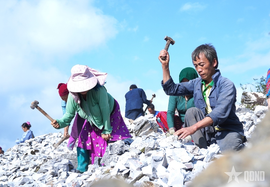 | Người già, phụ nữ và thanh niên xã Khâu Vai hăng say đập đá, mở đường – góp sức để nghị quyết của Đảng sớm đi vào cuộc sống. |