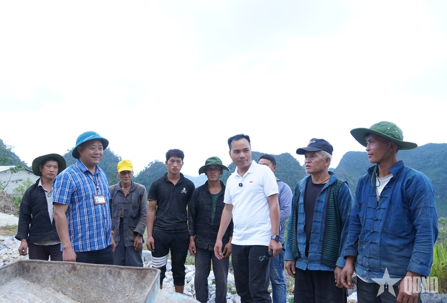 | Đồng chí Ngô Mạnh Cường (áo kẻ), Bí thư Đảng ủy xã Khâu Vai, cùng anh Nguyễn Tất Thắng (áo trắng) kiểm tra tiến độ thi công tuyến đường. |