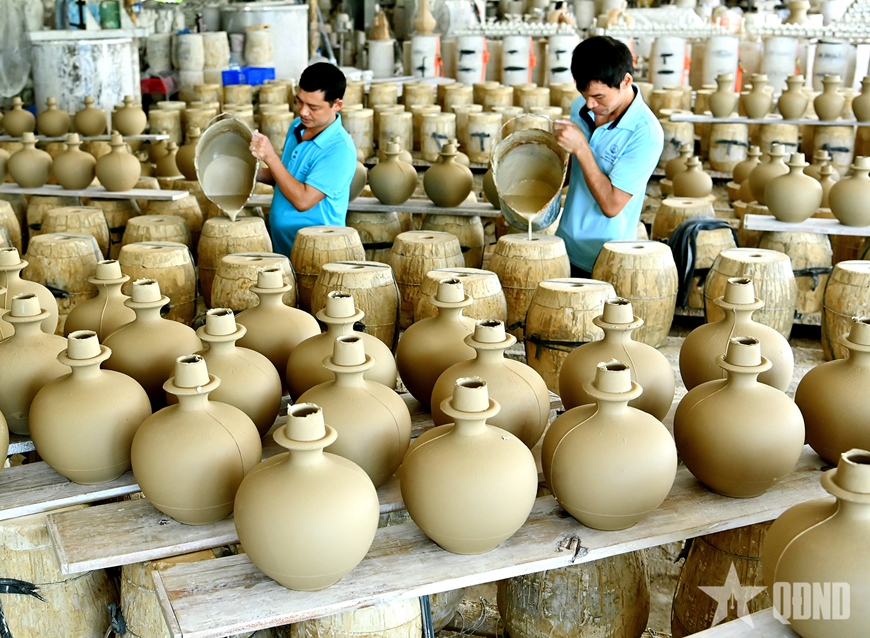 Chào mừng kỷ niệm 80 năm Cách mạng Tháng Tám và Quốc khánh 2-9, những ngày đầu tháng 8 vừa qua, các nghệ nhân, công nhân Công ty cổ phần Gốm Chu Đậu, xã Thái Tân (thành phố Hải Phòng) hối hả sản xuất mặt hàng bình gốm Giọt Ngọc, làm tặng phẩm tặng các đại biểu trong nước và quốc tế.