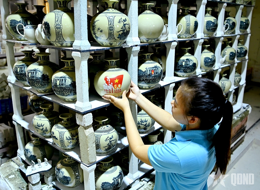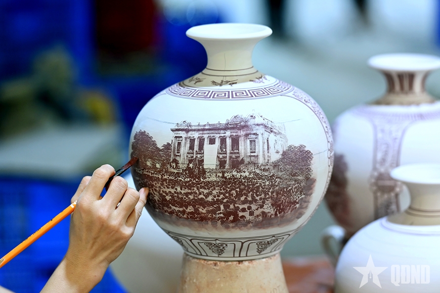 Trên nền men gốm Chu Đậu độc bản, cổ truyền, các nghệ nhân Chu Đậu đã kết hợp sáng tạo họa tiết chim Lạc với những hình ảnh lịch sử ghi đậm dấu ấn Cách mạng Tháng Tám và Quốc khánh 2-9.