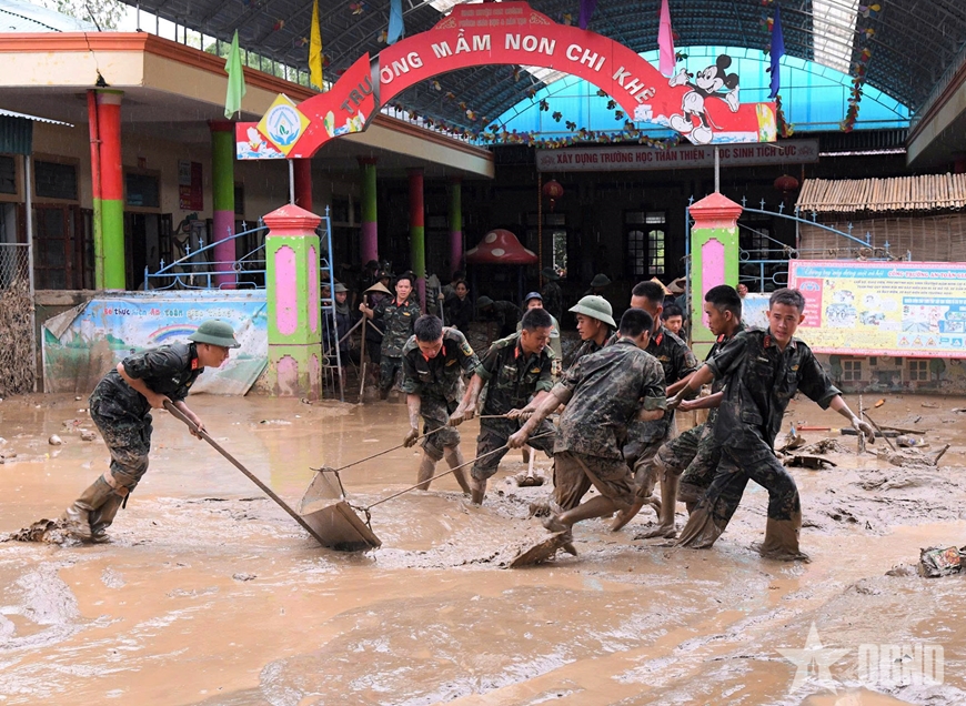 | Cán bộ, chiến sĩ Trung đoàn 335 (Sư đoàn 324) giúp Trường mầm non Chi Lê, xã Con Cuông dọn bùn đất sau lũ. |