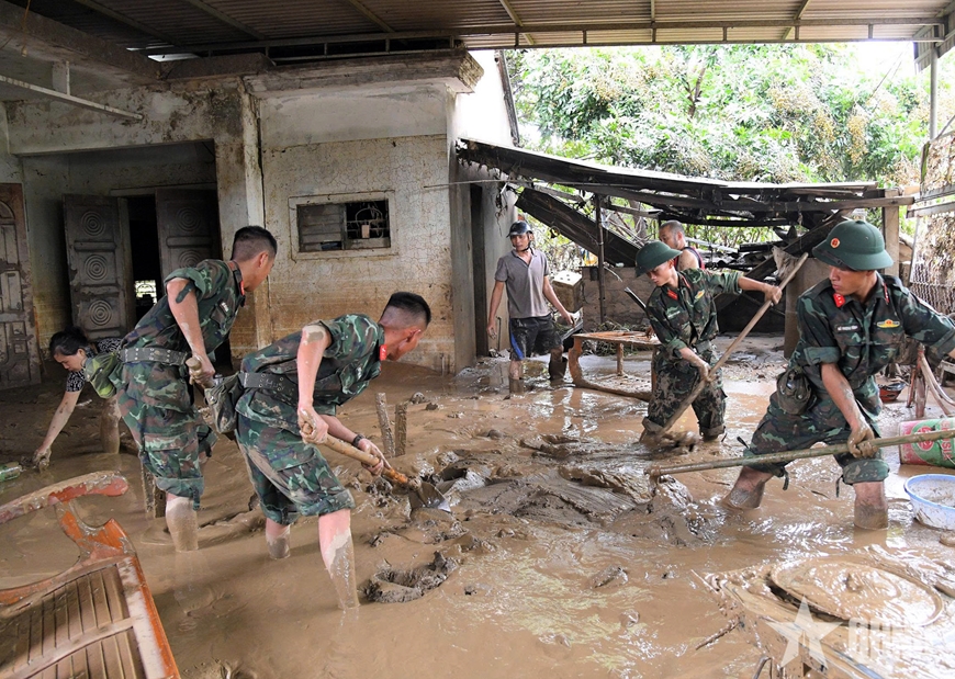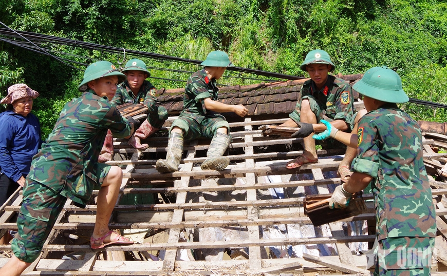 Cán bộ, chiến sĩ Trung đoàn 764 (Bộ CHQS tỉnh Nghệ An) dọn dẹp đống đổ nát giúp gia đình bà Hồ Thị Hà ở bản Cầu Tám, xã Mường Xén bị sập hoàn toàn do bão lũ.