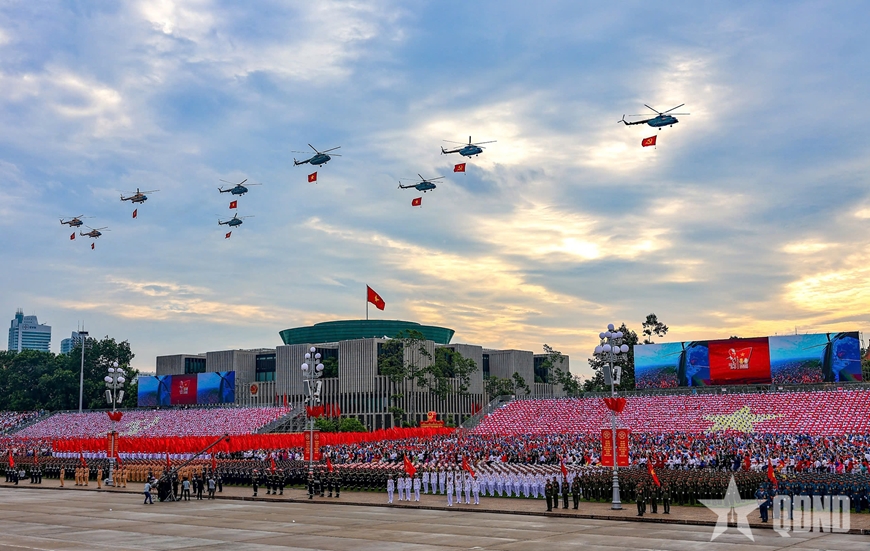 Mở màn là các biên đội trực thăng Mi-17, Mi-8, Mi-171 trang trọng treo Quốc kỳ và Đảng kỳ tung bay kiêu hãnh trên bầu trời Thủ đô, gửi gắm niềm tự hào dân tộc.