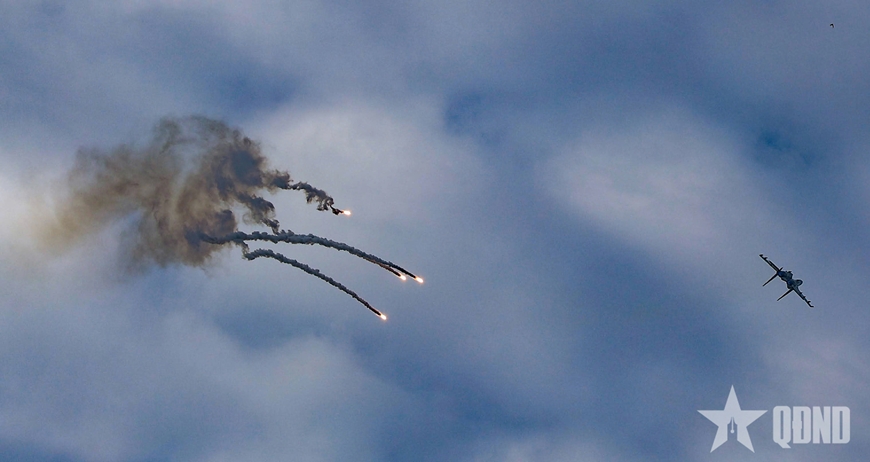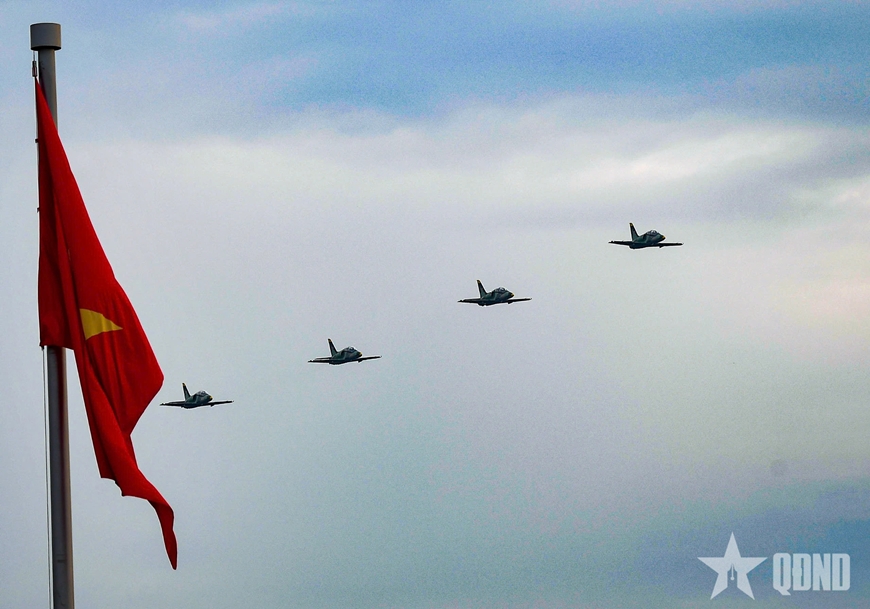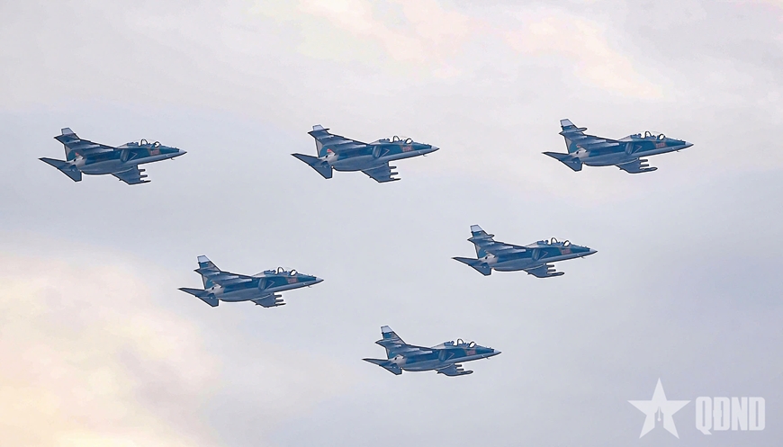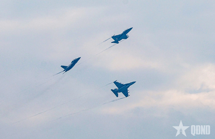 Lực lượng máy bay phản lực tiêm kích và huấn luyện được đại diện bởi Yak-130 và L-39NG. Đặc biệt, tâm điểm là sự xuất hiện đầy sức mạnh của "Hổ mang chúa" Su-30MK2. Đội hình tiêm kích đa năng thực hiện động tác nghiêng cánh chào trang trọng, kết hợp màn phóng bẫy nhiệt ngoạn mục, khẳng định khả năng sẵn sàng chiến đấu, bảo vệ vững chắc chủ quyền quốc gia.