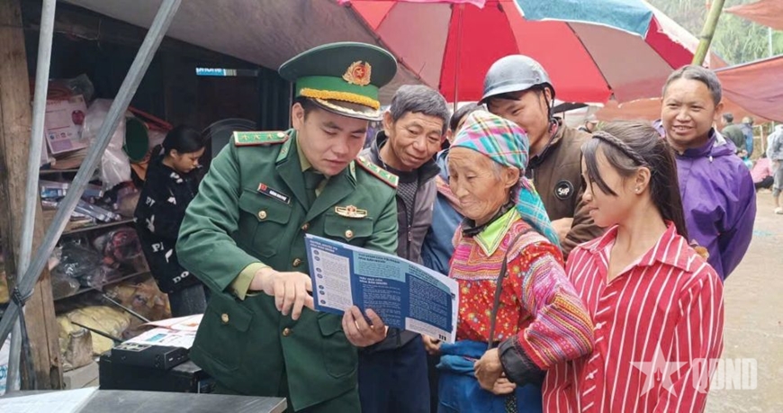 Đảng viên trẻ Đồn Biên phòng Thàng Tín tuyên truyền pháp luật cho bà con địa bàn. Ảnh: CTV Đồn Biên phòng Thàng Tín