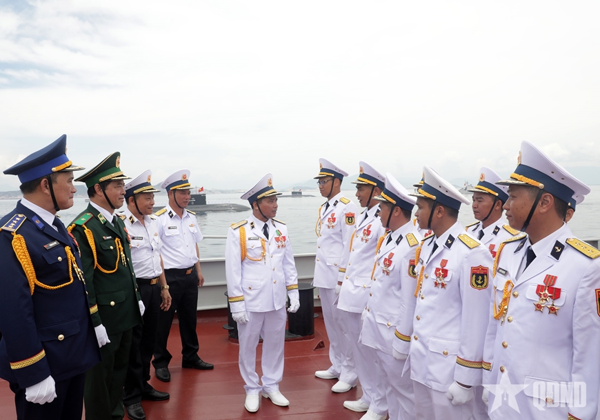 | Thủ trưởng Bộ tư lệnh Quân chủng Hải quân động viên các lực lượng tham gia diễu binh trên biển. |
