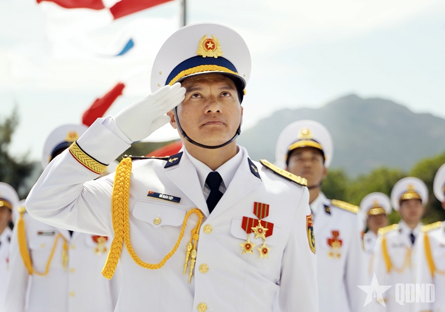 Trung tá Đỗ Xuân Tiệp, Thuyền trưởng Tàu 015-Trần Hưng Đạo, Lữ đoàn 162, cùng đồng đội trang nghiêm chào cờ trước khi xuất bến thực hiện nhiệm vụ diễu binh. Với nước da rám nắng, ánh mắt cương nghị, Trung tá Đỗ Xuân Tiệp cùng cán bộ, chiến sĩ Tàu 015-Trần Hưng Đạo ra sức luyện rèn để thực hiện xuất sắc nhiệm vụ tàu chỉ huy trong Lễ diễu binh trên biển vào mùa thu lịch sử.