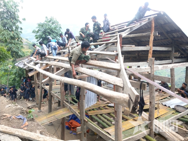 Cán bộ, chiến sĩ Đồn Biên phòng Xín Mần cùng nhân dân giúp hộ nghèo Lý A Ngò, thôn Đông Lợi, xã Xín Mần làm nhà ở.