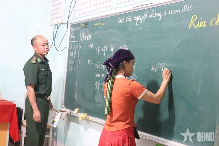 Tình quân dân nơi biên cương không chỉ được thể hiện qua những mái nhà dựng giúp dân hay những tuyến đường mở trên triền núi, mà còn được khắc họa đậm nét trong cuộc chiến chống “giặc dốt” - cuộc chiến lặng thầm nhưng quyết định tương lai văn hóa, kinh tế và an ninh vùng biên.