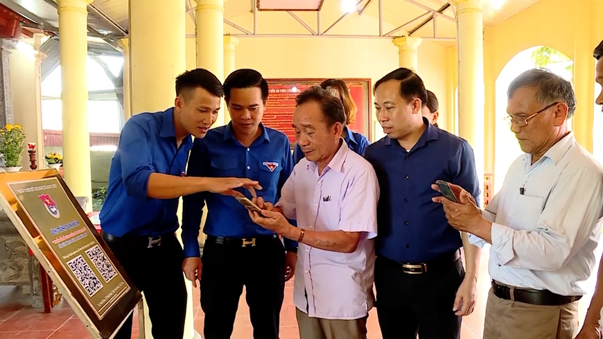 Đảng viên cao tuổi xã Khánh Nhạc, tỉnh Ninh Bình được các đoàn viên hỗ trợ, hướng dẫn sử dụng tài khoản định danh điện tử. Ảnh: KHÁNH HIỀN |