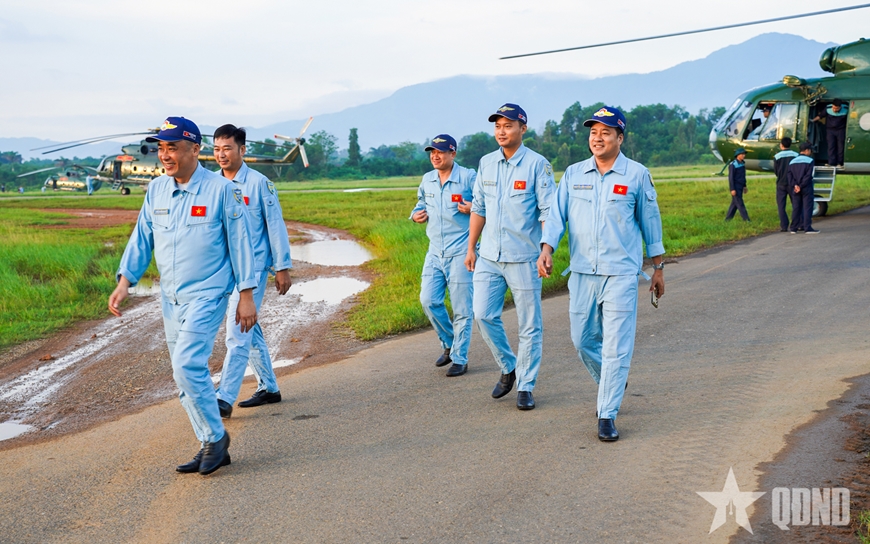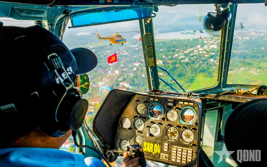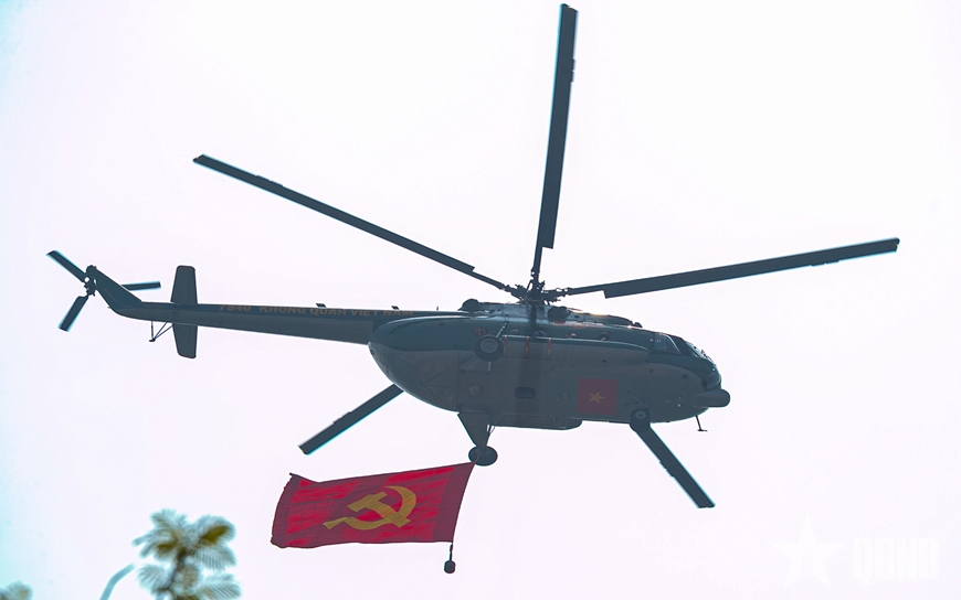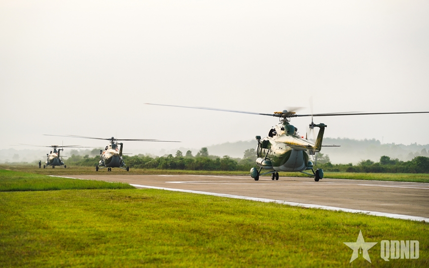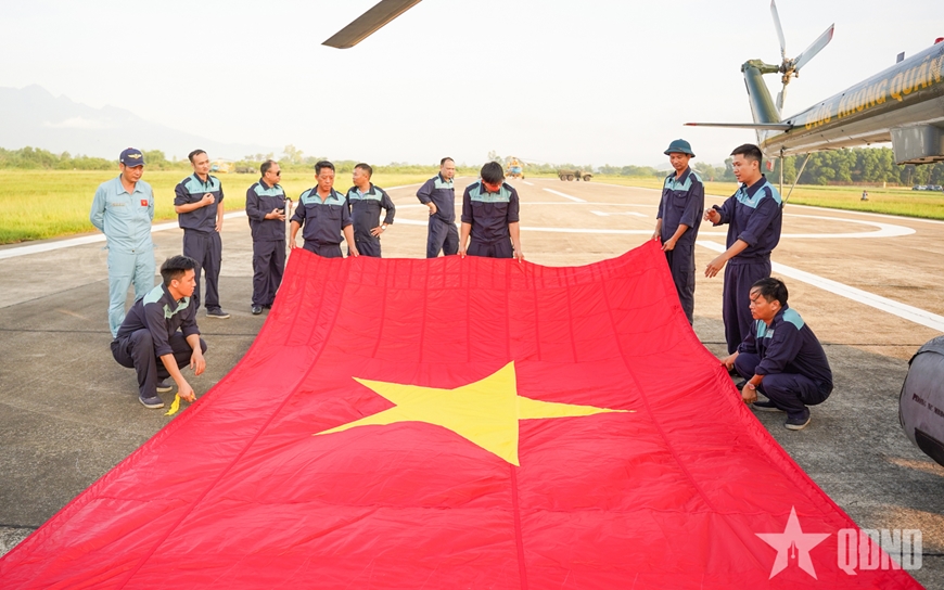 | 10 trực thăng Mi-8, Mi-17, Mi-171 và Mi-172 của các Trung đoàn Không quân 917, 916, 930 được chuẩn bị cờ Đảng, cờ Tổ quốc cho tập bay kéo cờ. Các biên đội trực thăng được tiếp nhiên liệu, nạp điện để sẵn sàng cho công tác huấn luyện bay. |