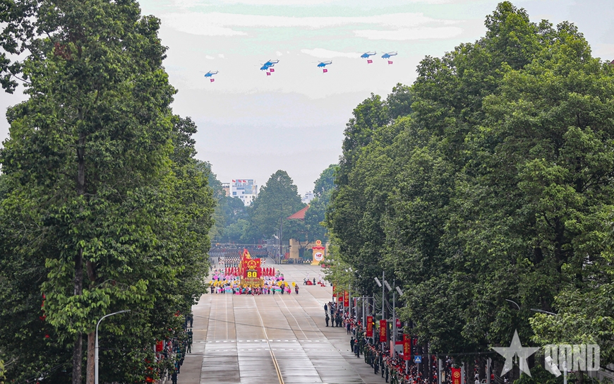 | Hình ảnh trực thăng bay huấn luyện kéo cờ trên bầu trời Hà Nội, bay qua Quảng trường Ba Đình. |