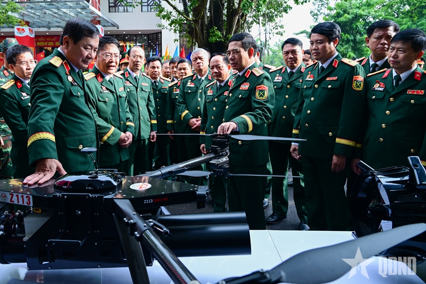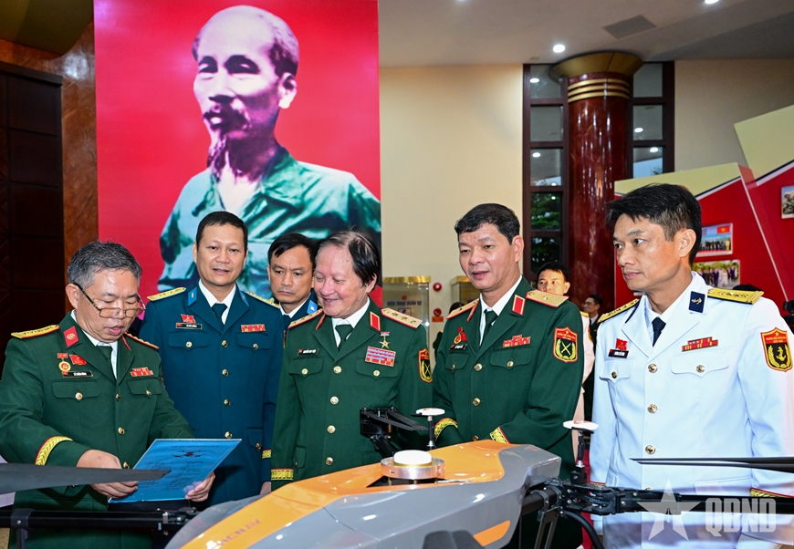 | Thượng tướng - Anh hùng LLVT Nhân dân, Viện sĩ Nguyễn Huy Hiệu, nguyên Thứ trưởng Bộ Quốc phòng (giữa) bày tỏ niềm vui và tự hào khi tận mắt xem và kiểm tra các tính năng tác chiến của các sản phẩm vũ khí, khí tài công nghệ cao mang thương hiệu Quốc phòng Việt Nam được trưng bày tại Đại hội. |