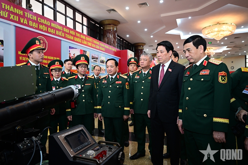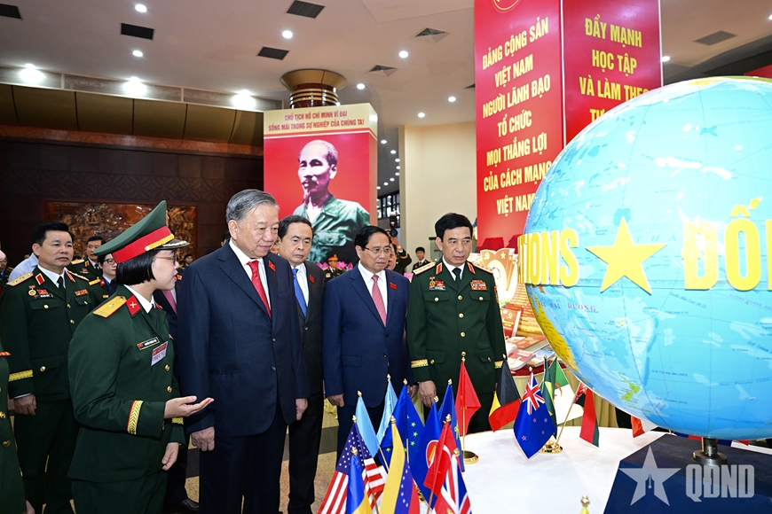Tổng Bí thư Tô Lâm cùng các đại biểu tham quan gian trưng bày phục vụ Đại hội đại biểu Đảng bộ Quân đội lần thứ XII, nhiệm kỳ 2025-2030.