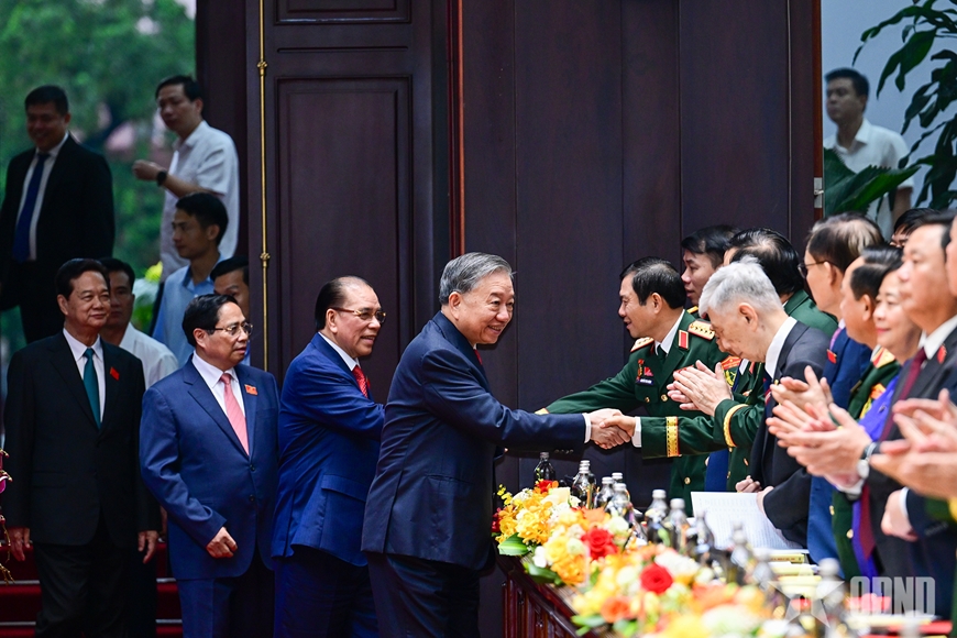 | Tổng Bí thư Tô Lâm, Bí thư Quân ủy Trung ương; Thủ tướng Chính phủ Phạm Minh Chính; Chủ tịch Quốc hội Trần Thanh Mẫn cùng các đại biểu dự đại hội. |