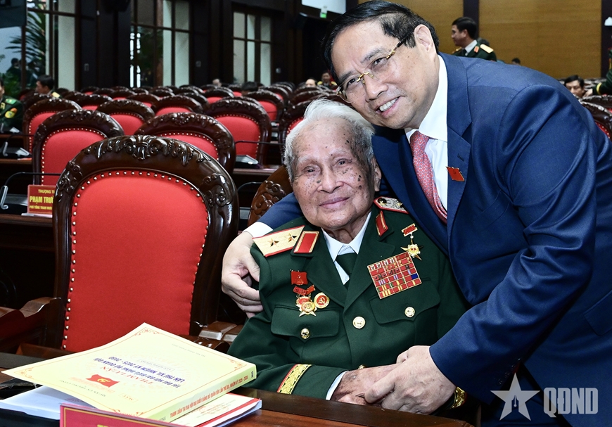 | Thủ tướng Chính phủ Phạm Minh Chính thăm hỏi động viên Trung tướng AHLLVTND Nguyễn Quốc Thước. |