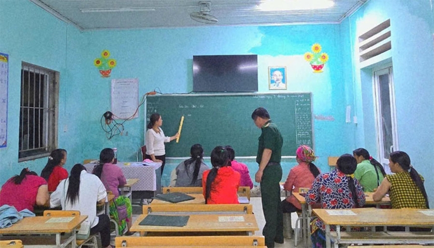 | Một tiết học của lớp xóa mù chữ tại xã Lao Chải, do Đồn Biên phòng Cửa khẩu Quốc tế Thanh Thủy phối hợp với giáo viên xã giảng dạy. |