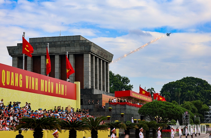 Không quân nhân dân Việt Nam với chiến đấu cơ hiện đại Su-30 MKII nghiêng cánh thả pháo nhiễu chào mừng 80 năm Cách mạng Tháng Tám và Quốc khánh 2-9.