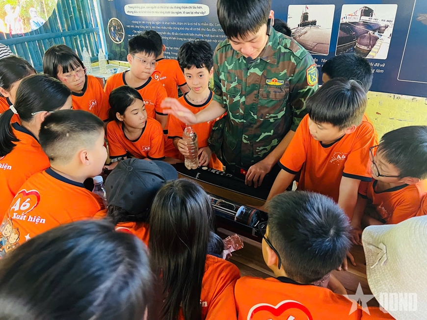 Các em háo hức nghe giới thiệu về tàu ngầm.