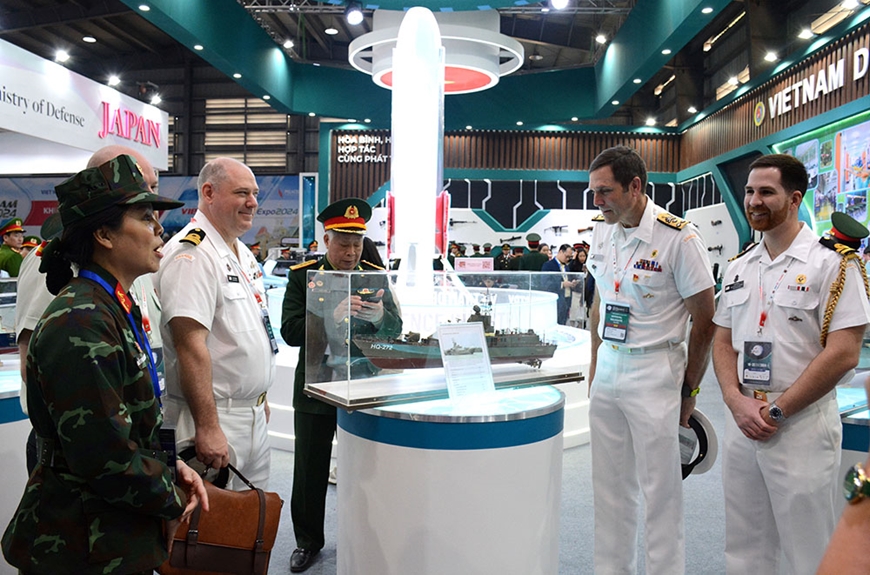 | Khách quốc tế tham quan khu trưng bày của công nghiệp quốc phòng Việt Nam tại Triển lãm Quốc phòng quốc tế Việt Nam 2024. Ảnh: HÀ PHƯƠNG |