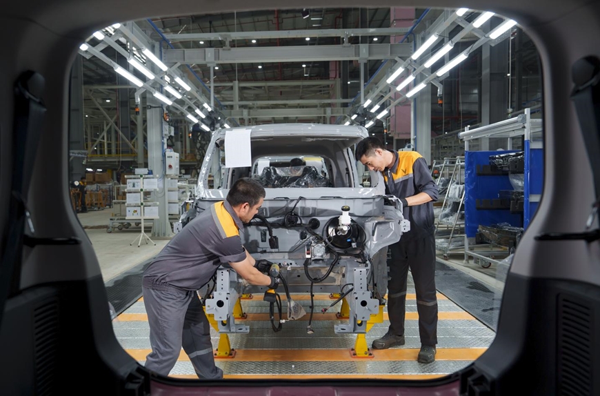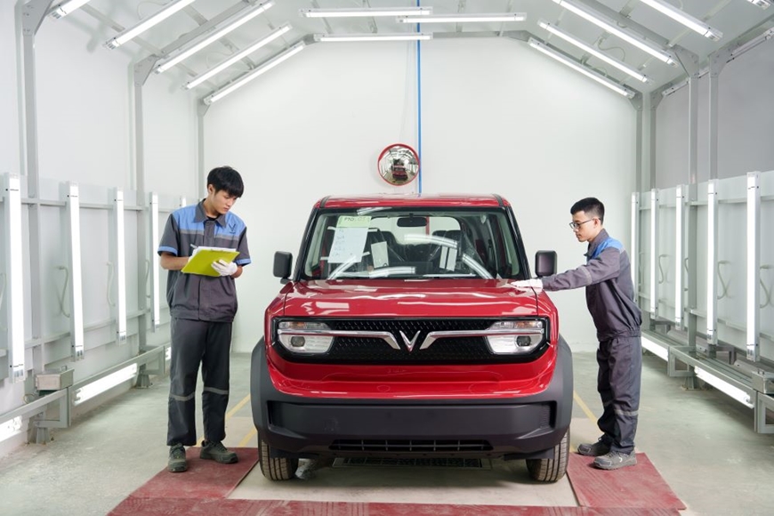 Để hoàn thiện một chiếc xe, hệ thống dây chuyền dài gần 1,5km, với công suất lên tới 35 xe mỗi giờ, bảo đảm hiệu suất cao và chất lượng đồng đều. Khi thân xe hoàn chỉnh được chuyển lên hệ thống băng chuyền treo trên cao, cả dây chuyền vận hành liền mạch, từng linh kiện được vận chuyển bằng xe tự hành đến đúng vị trí, đúng thời điểm, hạn chế tối đa sai sót và thời gian chờ. Khi chiếc xe tiến đến giai đoạn cuối cùng, trí tuệ nhân tạo tự động kiểm tra tiếng ồn, độ kín nước, khả năng vận hành trên đường thử mô phỏng 10 dạng địa hình. Mọi dữ liệu được lưu trữ và phân tích thời gian thực, bảo đảm chiếc xe hoàn thiện về an toàn kỹ thuật để trao tay khách hàng.