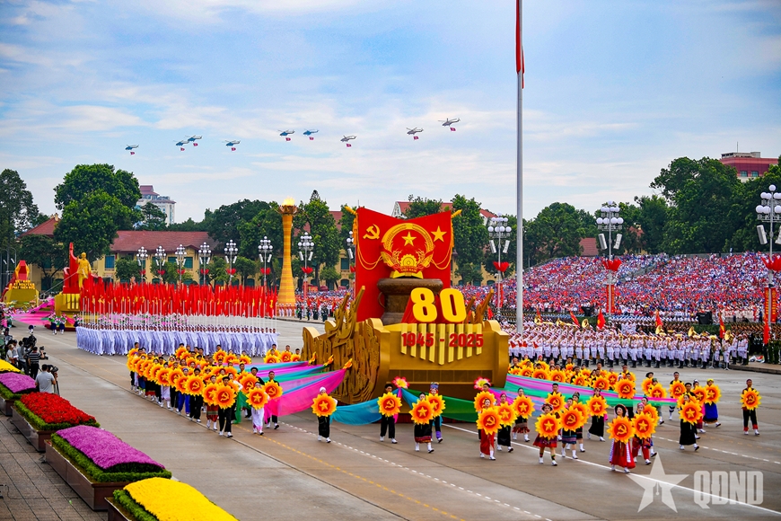 Khối diễu hành rực rỡ sắc màu, dẫn đầu là xe mô hình kỷ niệm 80 năm Quốc khánh Việt Nam (1945-2025), di chuyển qua Quảng trường Ba Đình lịch sử, thể hiện niềm tự hào và sức sống của dân tộc.