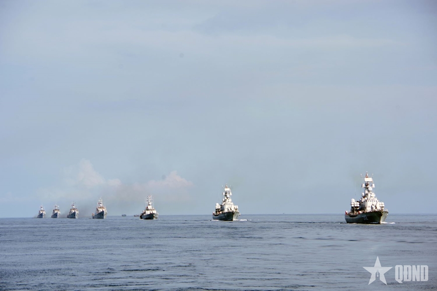 Thực hiện vận động đội hình hàng dọc của biên đội tàu Lữ đoàn 171 và Lữ đoàn 167 (Vùng 2 Hải quân).