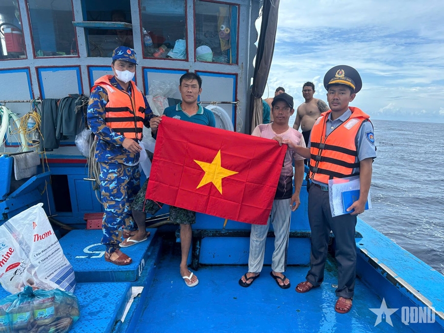 Cùng với đó, các lực lượng đã phát 4.996 tờ rơi (tăng 3.261 tờ), trao 1.235 lá cờ Tổ quốc (tăng 660 lá), hỗ trợ 5.538 lít nước ngọt và 165kg thực phẩm cho ngư dân (tăng 526 lít nước và 20kg thực phẩm so với năm 2024). Mỗi con số là một câu chuyện ấm áp giữa biển trời, là hình ảnh người lính và ngư dân tựa vào nhau mà bền bỉ hoàn thành nhiệm vụ, giữ cho vùng biển quê hương luôn bình yên.