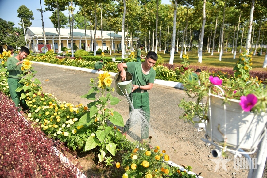 Cùng với công tác huấn luyện, sẵn sàng chiến đấu, cán bộ, chiến sĩ đơn vị còn dành thời gian chăm sóc vườn hoa, cây cảnh.