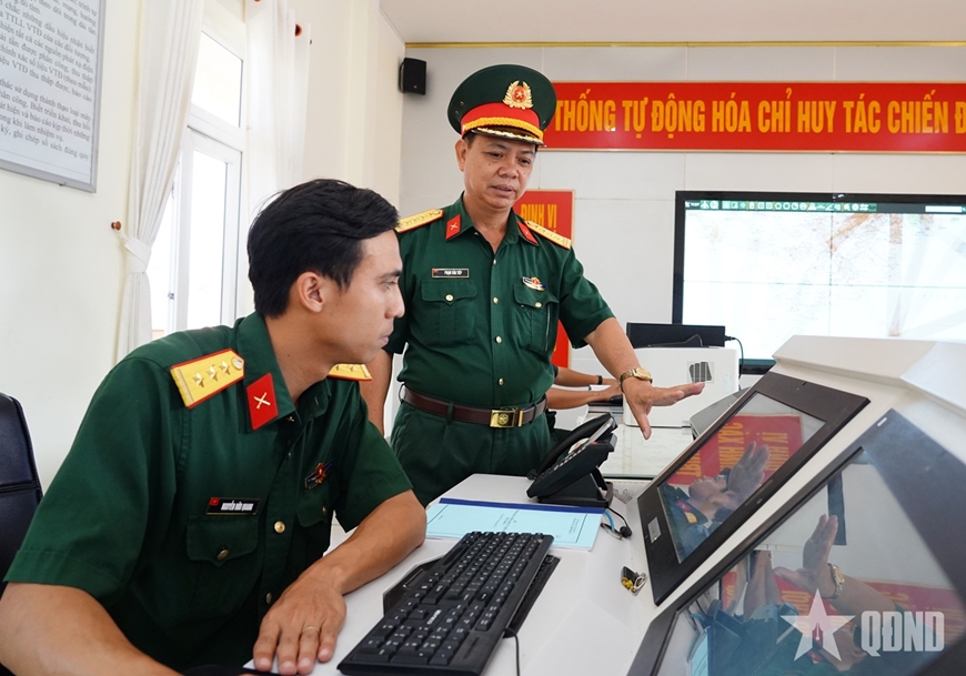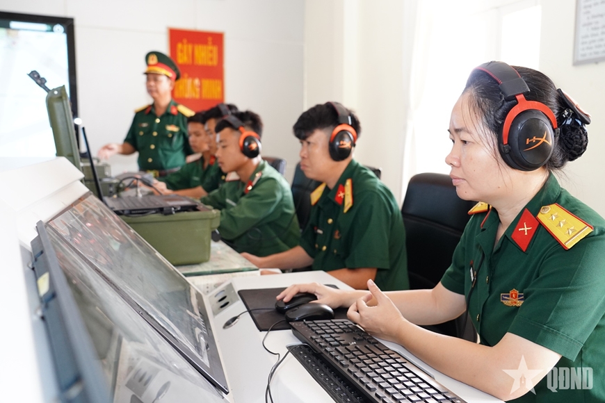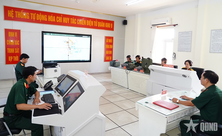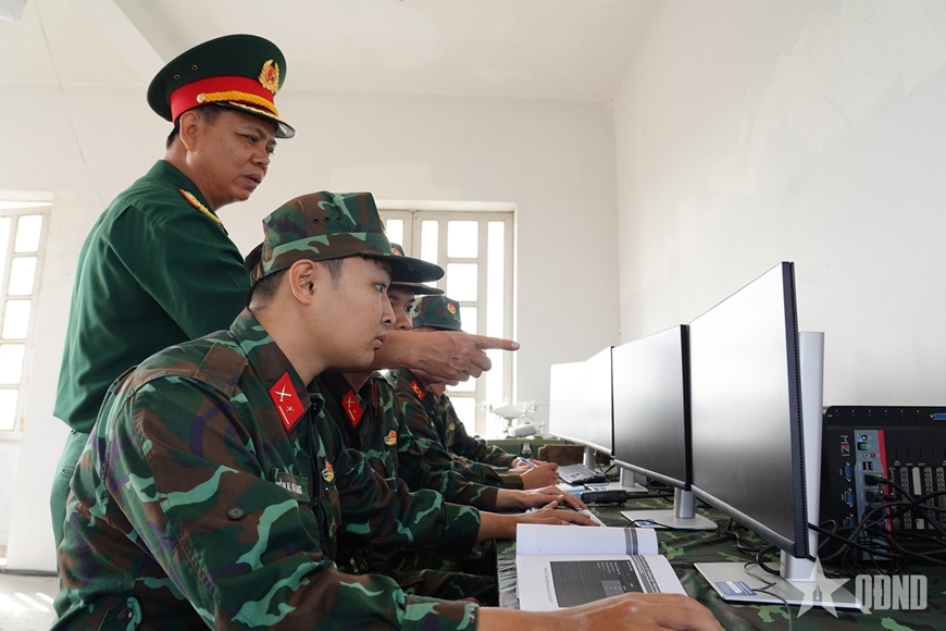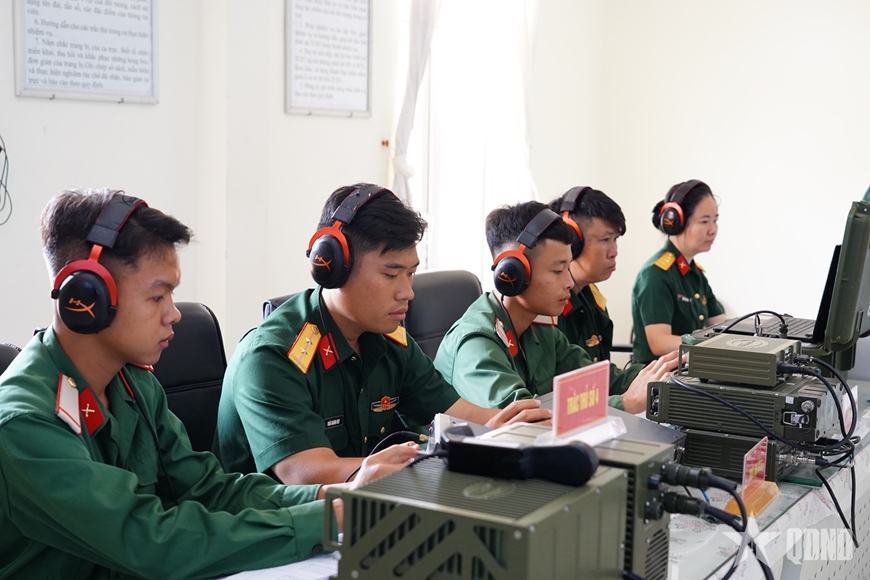 | Lãnh đạo Phòng Tác chiến Điện tử, Bộ Tham mưu Quân khu 9 kiểm tra kíp trực xử trí tình huống. |
