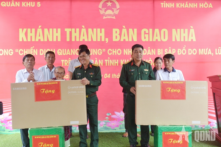 | Lãnh đạo Quân khu 5 trao biểu trưng tặng nhà các gia đình tại Khánh Hòa. |
