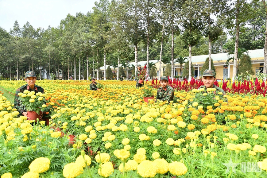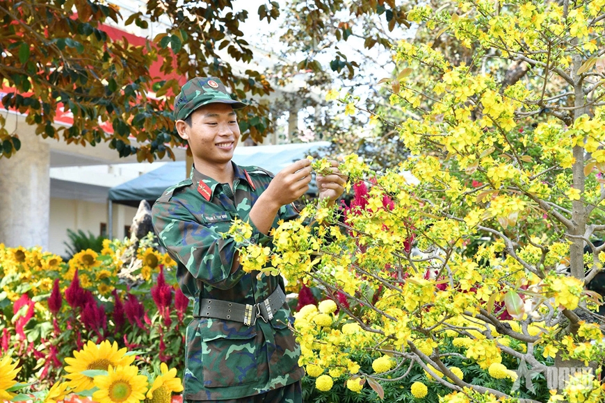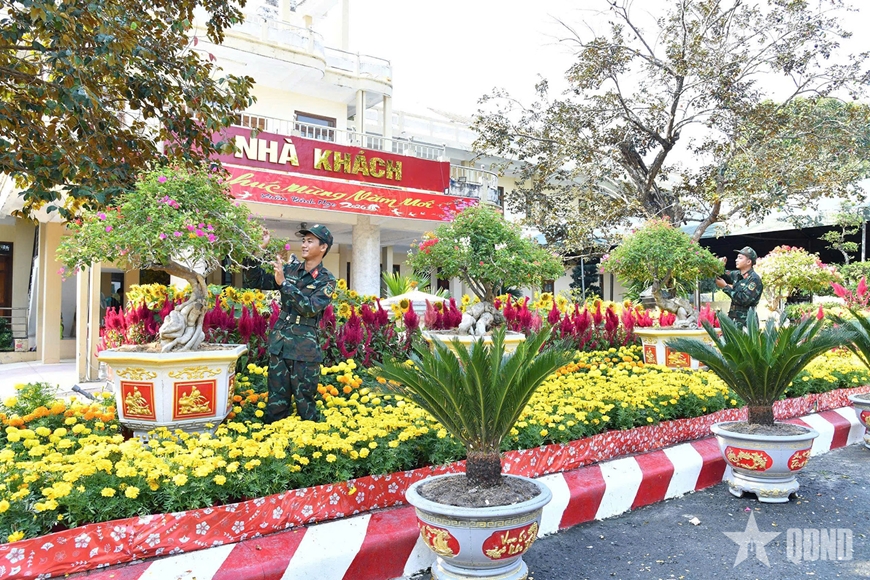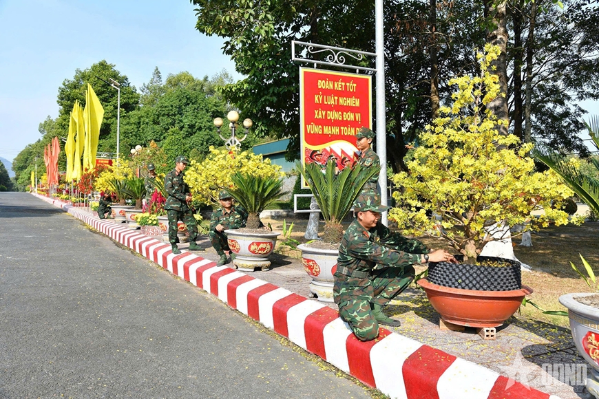Ngay từ đầu tháng Chạp, các đơn vị trong Sư đoàn 330 đã chủ động xây dựng kế hoạch chi tiết, triển khai hoạt động trang trí, vệ sinh doanh trại, tạo không gian tươi mới để chào đón Tết. Với tinh thần “Cán bộ, chiến sĩ đón Xuân vui tươi, an toàn, tiết kiệm, sẵn sàng chiến đấu cao”, Sư đoàn đã làm tốt mọi công tác chuẩn bị tu sửa doanh trại, chăm sóc cảnh quan khuôn viên đơn vị. Từng lá cờ, băng rôn, khẩu hiệu, các loại hoa Tết được bố trí trên các hệ thống trục đường, khuôn viên chu đáo, tỉ mỉ. Cùng với đó, các đơn vị tổ chức bày trí bàn thờ Tổ quốc, linh vật của năm góp phần tô điểm sắc Xuân rộn ràng. Khắp doanh trại như bừng lên những gam màu rực rỡ của hoa và âm thanh náo nức của mùa Xuân, tạo cảm giác vui tươi, phấn khởi, ấm áp cho các chiến sĩ lần đầu tiên ăn Tết xa nhà.
