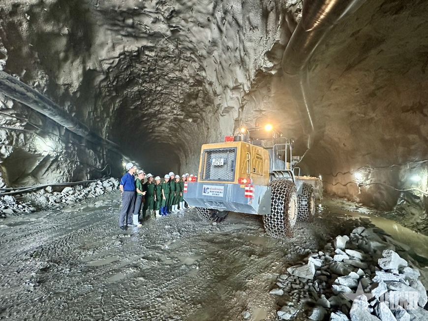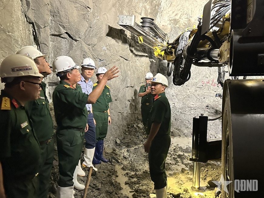 | Đoàn công tác của Tổng công ty kiểm tra công tác khoan hầm trong lòng núi. |