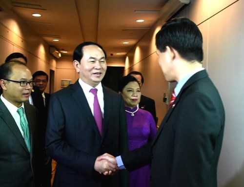 Ngay sau khi đặt chân tới Singapore, Chủ tịch nước Trần Đại Quang đã có cuộc gặp gỡ thân mật và trò chuyện với cán bộ nhân viên Đại sứ quán, đại diện cộng đồng người Việt Nam tại Singapore.