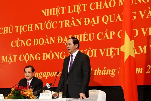 Tại buổi gặp mặt, Chủ tịch nước Trần Đại Quang đã chuyển lời thăm hỏi ân cần của lãnh đạo Đảng và Nhà nước tới cán bộ nhân viên Đại sứ quán, đại diện cộng đồng người Việt Nam tại Singapore. Chủ tịch nước đã thông báo về tình hình kinh kế, chính trị trong nước và quốc tế, về quan hệ Đối tác Chiến lược giữa Việt Nam và Singapore và các hoạt động cơ bản trong chuyến thăm. Chủ tịch nước hoan nghênh ý kiến của hai giáo sư và các em học sinh, khẳng định chính sách nhất quán của Đảng và Nhà nước Việt Nam luôn coi trọng nhân tài, tìm cách thu hút nguồn nhân lực chất lượng cao, trong đó nhiều người trong cộng đồng người Việt ở Singapore, về xây dựng đất nước. Chủ tịch nước mong muốn bà con tại Singapore đoàn kết, chấp hành luật pháp nước sở tại, hòa nhập với cộng đồng, đóng góp phần công sức của mình vào việc củng cố và phát triển quan hệ hợp tác hữu nghị Việt Nam-Singapore.