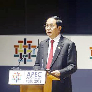 Chủ tịch nước cũng nhấn mạnh nỗ lực xây dựng Nhà nước kiến tạo, minh bạch, hiệu quả, vì người dân và doanh nghiệp. Tập trung hoàn thiện thể chế, chính sách, pháp luật, bảo vệ môi trường, mở rộng không gian kinh doanh cho các chủ thể; khơi dậy mọi tiềm năng của doanh nghiệp, tăng cường trách nhiệm thực thi, đề cao thượng tôn pháp luật, tạo động lực mới cho phát triển kinh tế - xã hội. Là nền kinh tế năng động có độ mở lớn và là điểm đến của nhiều tập đoàn đa quốc gia, Việt Nam ngày càng gắn kết sâu rộng với hai bờ Thái Bình Dương thông qua các quan hệ đối tác, Cộng đồng ASEAN và mạng lưới 16 FTA với 59 đối tác, trong đó có 18 nền kinh tế thành viên APEC. Hợp tác hiệu quả của các doanh nghiệp APEC tại Việt Nam cũng như các doanh nghiệp Việt Nam tại các nền kinh tế APEC là minh chứng sinh động của sự gắn kết này. Có thể kể đến thành công của tập đoàn Viettel, doanh nghiệp viễn thông hàng đầu của Việt Nam, tại Pê-ru.
