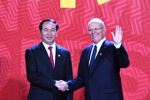 Tổng thống Pê-ru Kúc-xin-xki đón chào Chủ tịch nước Trần Đại Quang tại Hội nghị cấp cao APEC.