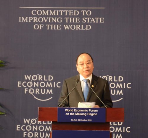 Phát biểu khai mạc diễn đàn, Thủ tướng Nguyễn Xuân Phúc nhấn mạnh, hiện nay khu vực Mê Công là một trung tâm phát triển năng động ở châu Á với nhiều nền kinh tế tăng trưởng nhanh nhờ đẩy mạnh cải cách và hội nhập quốc tế. Theo báo cáo của Quỹ Tiền tệ Quốc tế (IMF), khu vực Mê Công có 4/25 nền kinh tế tăng trưởng nhanh hàng đầu thế giới năm 2015, trong đó Cam-pu-chia, Lào, Myanmar tăng trưởng hơn 7%, Việt Nam tăng trưởng 6,7% và Thái Lan đang phục hồi tích cực. Khu vực Mê Công là điểm kết nối quan trọng ở châu Á và là một thị trường giàu tiềm năng với dân số 240 triệu người và quy mô GDP hơn 660 tỷ USD. Sự ra đời của Cộng đồng ASEAN cuối năm 2015 cùng với sự phát triển của các hành lang giao thông trong tiểu vùng và các liên kết kinh tế trong khu vực đang mở ra không gian phát triển rộng lớn cho các doanh nghiệp, nhà đầu tư. Tuy nhiên, Thủ tướng Nguyễn Xuân Phúc cũng cho rằng, khu vực Mê Công đang gặp không ít thách thức. “Đó là khoảng cách phát triển với các nền kinh tế khác trong ASEAN còn lớn, lợi thế lao động chi phí thấp đang giảm dần, biến đổi khí hậu diễn ra nhanh hơn dự báo”, Thủ tướng Nguyễn Xuân Phúc nhấn mạnh.