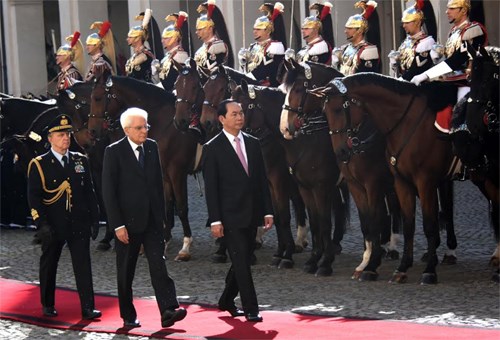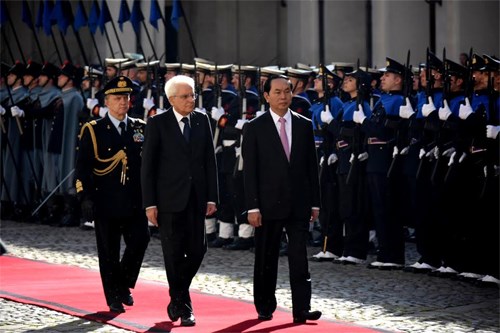 Sáng 22-11, tại Phủ Tổng thống I-ta-li-a đã diễn ra Lễ đón trọng thể Chủ tịch nước Trần Đại Quang. Sau lễ đón, Chủ tịch nước Trần Đại Quang và Tổng thống Séc-giô Mát-ta-rê-la đã tiến hành hội đàm.