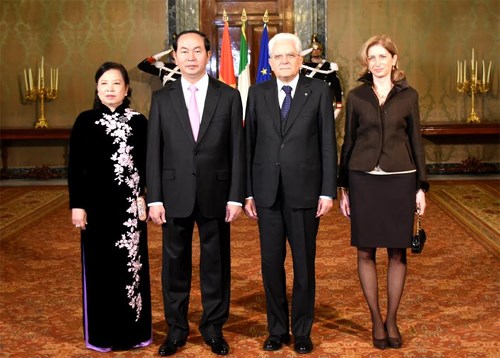 Tối cùng ngày, tại Phủ Tổng thống I-ta-li-a, Tổng thống Séc-giô Mát-ta-rê-la đã mở tiệc Quốc yến chào mừng Chủ tịch nước và Phu nhân, cùng Đoàn đại biểu cấp cao Việt Nam thăm cấp Nhà nước tới I-ta-li-a.