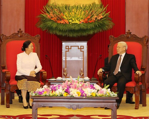 Tổng Bí thư Nguyễn Phú Trọng khẳng định, Việt Nam ủng hộ mạnh mẽ và toàn diện đối với công cuộc đổi mới, bảo vệ và xây dựng đất nước Lào. Tổng Bí thư đánh giá cao kết quả hợp tác giữa hai Quốc hội trong thời gian qua và đề nghị trong thời gian tới, Quốc hội hai nước, cũng như các Ủy ban của Quốc hội tăng cường hơn nữa hợp tác, trao đổi thông tin, kinh nghiệm, chuyên môn nghiệp vụ trong lĩnh vực lập pháp, giám sát và quyết định những vấn đề lớn của đất nước; tăng cường kiểm tra, giám sát, đôn đốc, chỉ đạo các bộ, ngành, địa phương, kể cả các doanh nghiệp trong việc triển khai thực hiện các Tuyên bố chung Việt Nam-Lào và các thoả thuận giữa lãnh đạo cấp cao hai Đảng, hai nước, Hiệp định hợp tác giữa hai Chính phủ và các chương trình, kế hoạch hợp tác giữa hai bên; tổ chức tốt các hoạt động kỷ niệm 55 năm Ngày thiết lập quan hệ ngoại giao, 40 năm Ngày ký Hiệp ước Hữu nghị và Hợp tác Việt Nam-Lào.