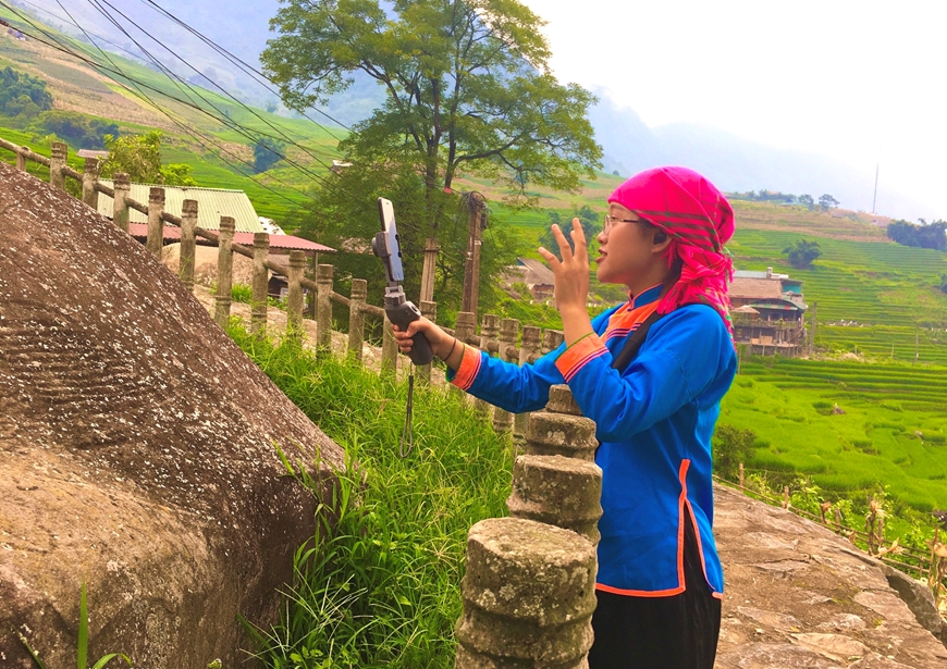 | Vũ Thị Ngọc Hướng thực hiện cảnh quay trong tour du lịch online tìm hiểu bãi đá cổ Sa Pa. Ảnh do nhân vật cung cấp |