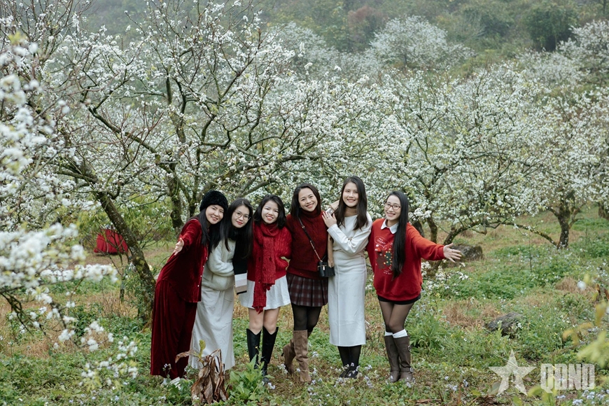 Khách du lịch chụp ảnh tại vườn mận tại phường Mộc Châu, Sơn La.