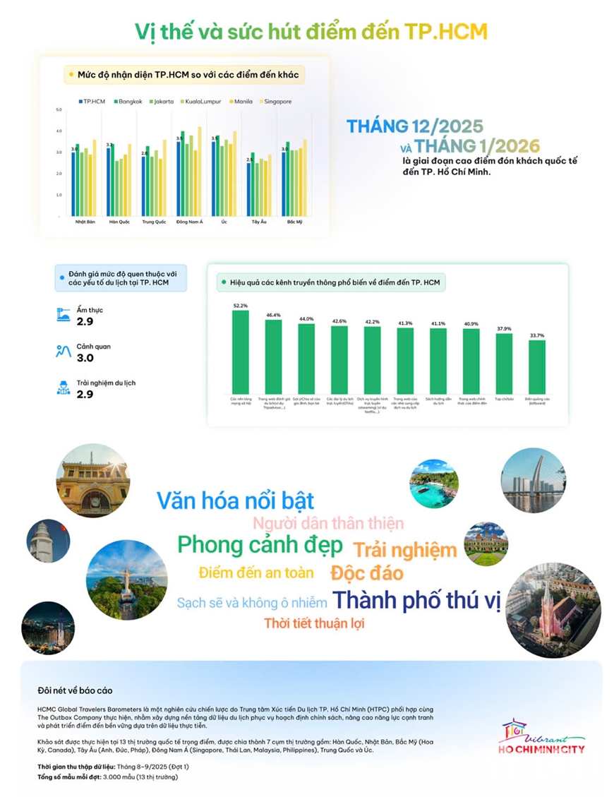 Bên cạnh đó, kết quả từ HCMC GTB cho thấy TP Hồ Chí Minh nằm trong nhóm điểm đến có mức độ nhận biết cao tại các thị trường Đông Nam Á, Australia và Hàn Quốc. Thành phố giữ vị trí nổi bật trong các lựa chọn điểm đến đô thị của khu vực, chỉ sau những trung tâm du lịch lớn như: Singapore, Bangkok (Thái Lan) hay Kuala Lumpur (Malaysia), củng cố vị thế điểm đến quốc tế quan trọng hàng đầu của Việt Nam. Dự báo cho thấy, ý định du lịch đến TP Hồ Chí Minh của du khách gia tăng rõ rệt vào giai đoạn cuối năm và tháng 1 năm sau, đánh dấu một thời điểm quan trọng cho hoạt động du lịch của thành phố.
