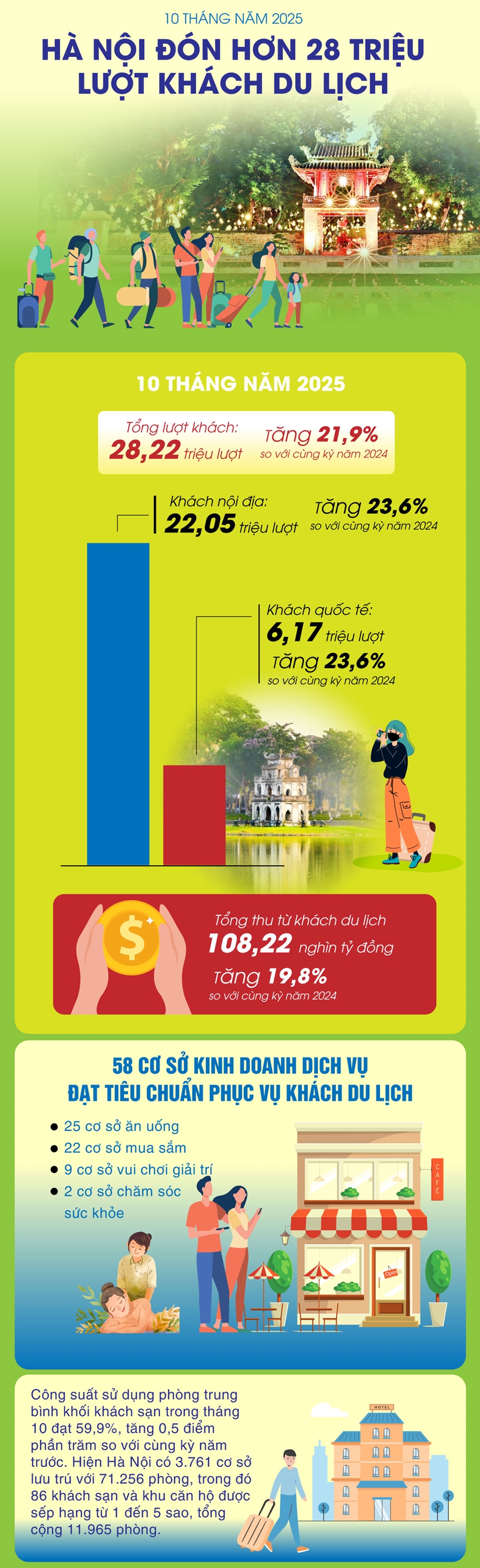 Trong 10 tháng đầu năm 2025, Hà Nội đón hơn 28,2 triệu lượt du khách. Trong đó, lượng khách quốc tế đạt hơn 6,1 triệu, khẳng định sức hút ngày càng lớn của Hà Nội trên bản đồ du lịch Việt Nam và thế giới.