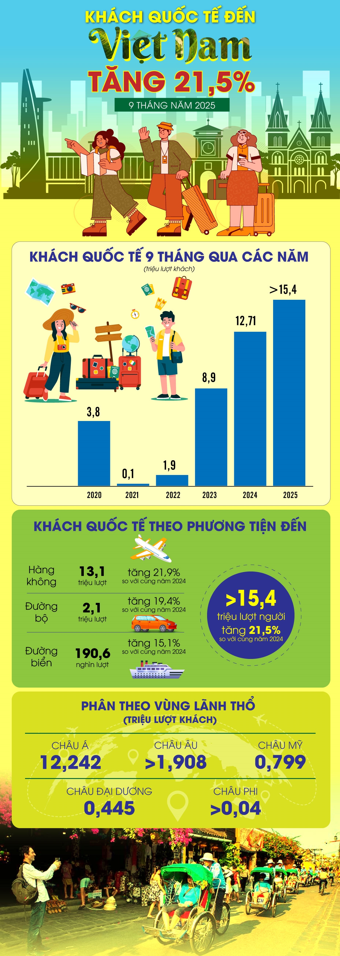 9 tháng năm 2025, khách quốc tế đến Việt Nam đạt hơn 15,4 triệu lượt người, tăng 21,5% so với cùng kỳ năm trước.
