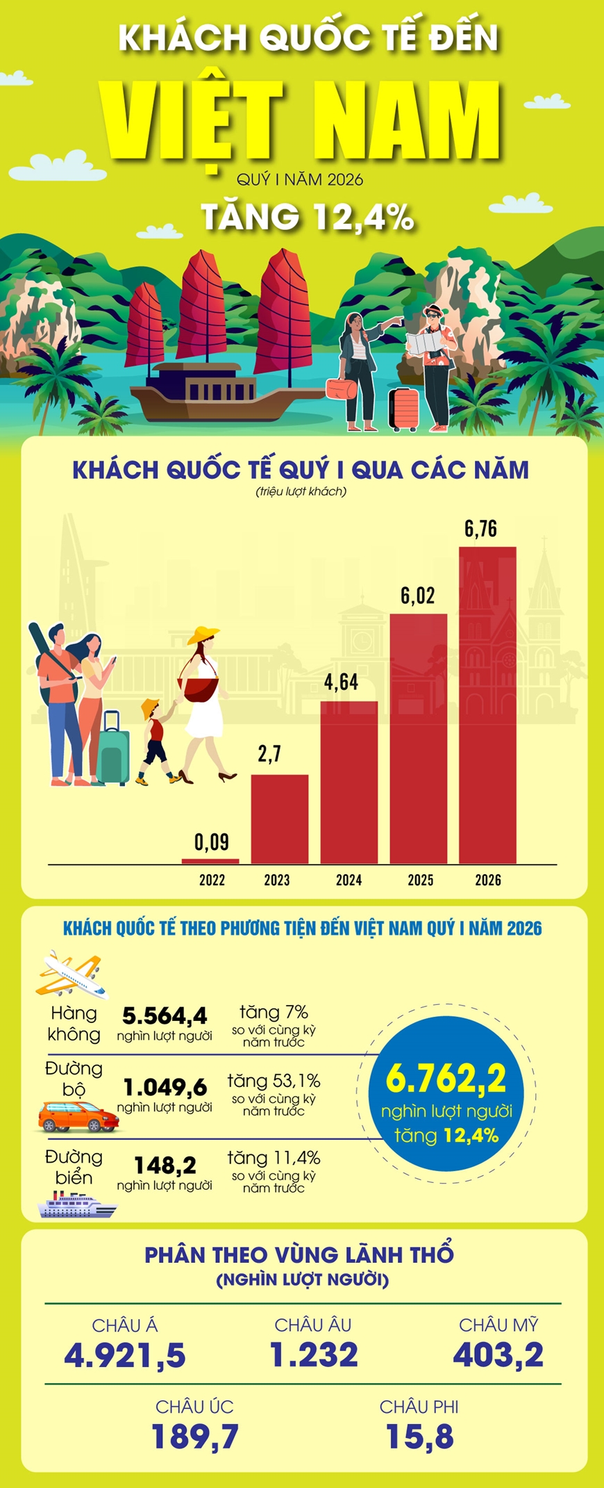Tính chung quý I-2026, khách quốc tế đến Việt Nam đạt 6,76 triệu lượt người, tăng 12,4% so với cùng kỳ năm trước và là mức cao nhất của quý I các năm từ trước đến nay.